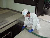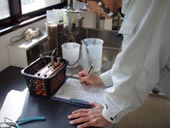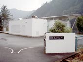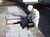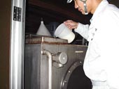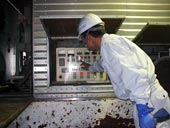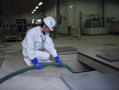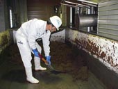 汚泥を脱水している風景です。汚泥の脱水は、汚泥中の水分を減水することによって汚泥の減量化を図るのが目的です。脱水した汚泥はコンポスト化施設に持ち込み、肥料にして再利用します。